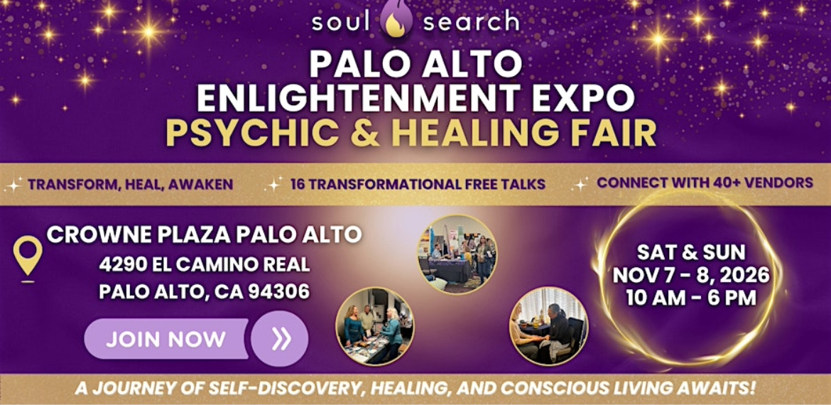 Join us for our 2-day Enlightenment Expo, Saturday–Sunday, November 7 – 8, 2026. Enjoy transformational talks and workshops all weekend. Meet energy healers, spiritual guides, mediums, psychics, astrologers, intuitive artists, holistic health experts, and more at the SoulSearch Palo Alto Enlightenment Expo & Psychic & Healing Fair!